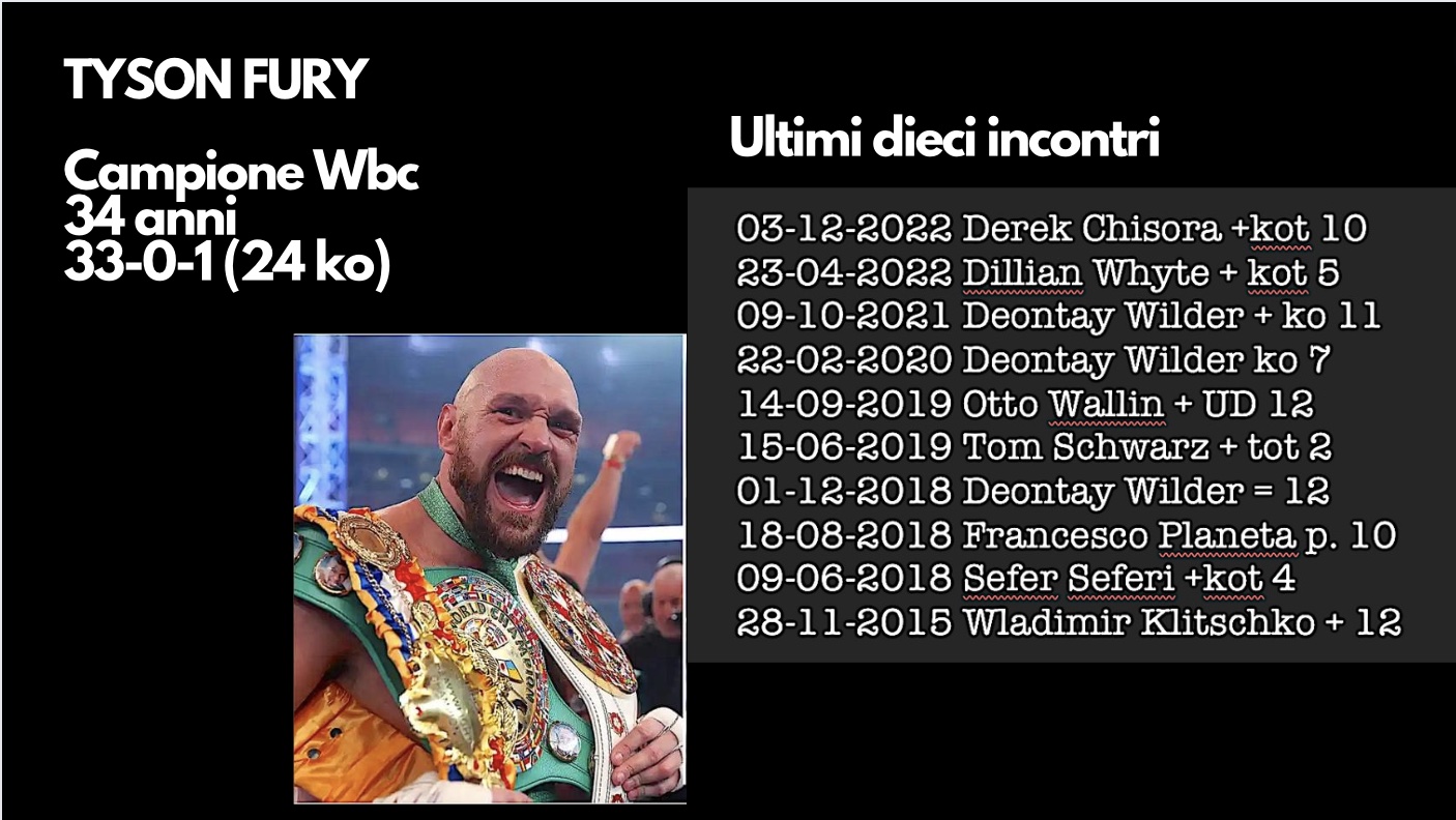 Tyson Fury potrebbe misurarsi con chiunque, ma sembra sia a corto di motivazioni. Meglio un ex campione delle arti marziali come Ngannou, che affronterà il 28 ottobre in Arabia Saudita, che un avversario contro cui potrebbe rischiare. Tanto per chiarire, nell’ultimo incontro ha affrontato Chisora. Uno che aveva perso nettamente (dominato ai punti nel primo, messo fuori combattimento nel secondo) le prime due sfide contro di lui. Uno che gli era inferiore per stazza fisica, abilità, energia, potenza, record, titoli conquistati. Uno che lo stesso WBC, l’Ente che sanciva il Mondiale, metteva al quattordicesimo posto della classifica.