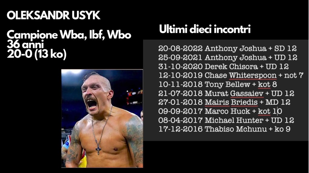 Oleksandr Usyk è fermo dalla seconda vittoria contro Joshua. Tra un mese, sarà passato un anno. Per lui sono stati annunciati Fury e Wilder. Affronterà Daniel Dubois il 26 agosto a Wroclaw. Usyk, per titoli e valori tecnici, è un fuoriclasse. Tra i massimi però ha disputato solo quattro match, due contro lo stesso pugile e due contro rivali di livello medio/basso. Poco per potere dare un giudizio definitivo su di lui.