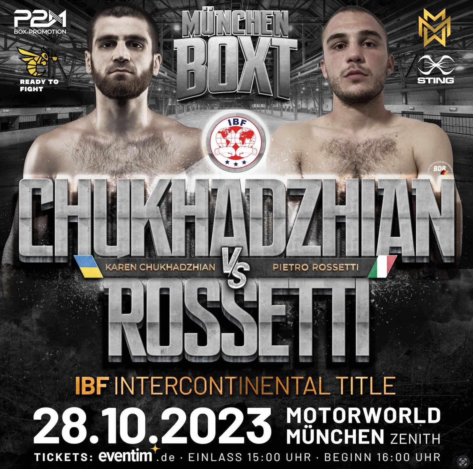 Pietro Rossetti (18-1-0, 8 ko) il 28 ottobre sarà a Monaco per sfidare Karen Chukhadzhian (22-2-0, 12 ko). In palio il titolo Internazionale IBF dei pesi welter. L’ucraino, che si è anche battuto per la corona ad interim dell’International Boxing Federation, perdendo ai punti contro Jeron Ennis (29-0), è residente in Germania e potrà godere sull’appoggio del pubblico.