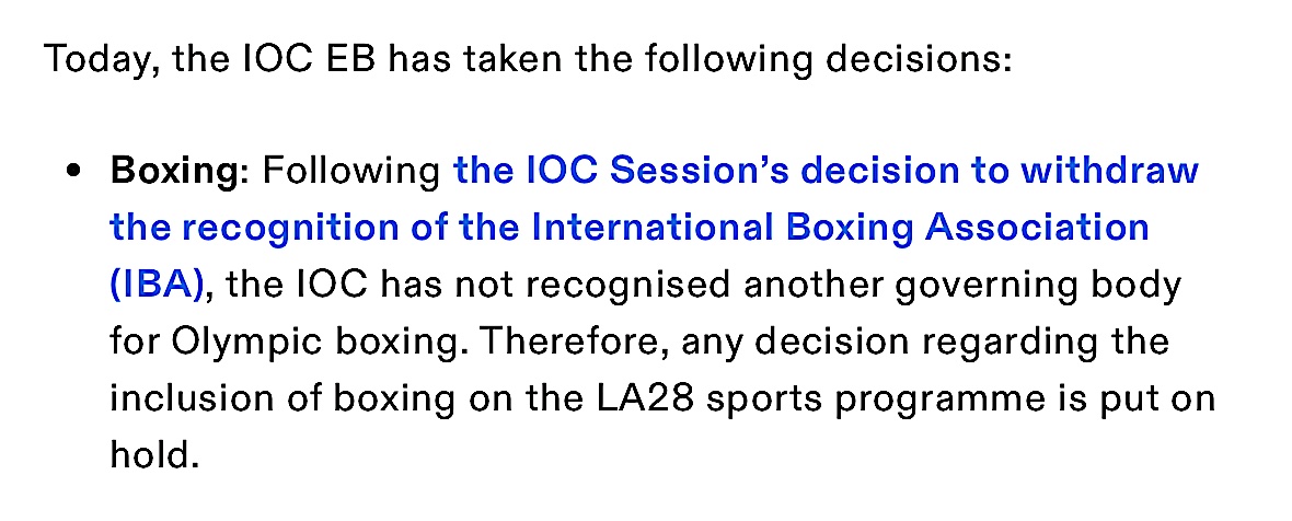 Il 22 giugno 2023, il CIO ha tolto all’International Boxing Association il riconoscimento di Federazione Internazionale e le ha vietato qualsiasi coinvolgimento nella gestione dei tornei olimpici e delle qualificazioni ai Giochi.