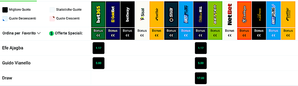 Ma non mi sbilancerei così tanto come hanno fatto i bookmaker, tra cui William Hill. Pagano 5/1 l’italiano (punti 100 euro, ne vinci 500), 1.17/1 il nigeriano (punti 100 euro, ne vinci 17).