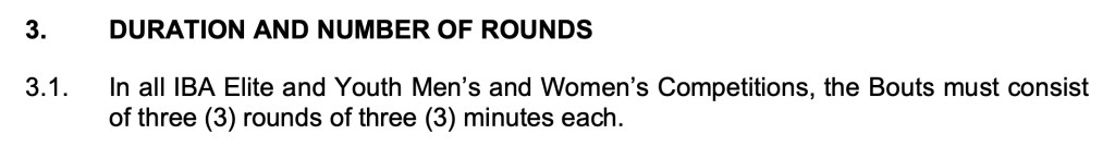 Alle sole Pugili Elite è consentito gareggiare sulla distanza delle quattro riprese di due minuti ciascuna, con l’intervallo di un minuto tra le riprese, con possibilità di indossare una maglietta a maniche corte o “top” aderente in sostituzione della canotta di cui all’art. 31 comma 2 del Regolamento. Esse gareggiano, inoltre, indossando il casco e i guanti previsti dal Regolamento per i pugili appartenenti alle diverse qualifiche e categorie del Settore IBA.