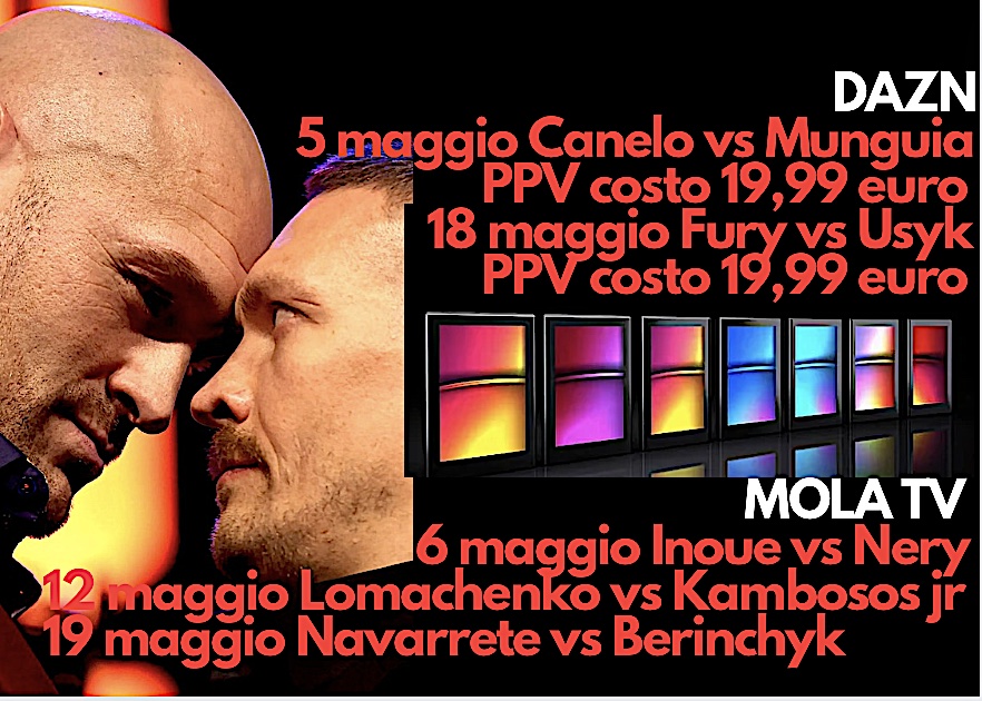 Il 18, Tyson Fury (34-0-1, 24 ko) vs Olexander Usyk (21-0, 14 ko) per il titolo unificato dei pesi massimi da Riyadh. Anche qui trasmissione in PPV a 19,99 euro. Diretta tv dalle 18 (ora italiana).