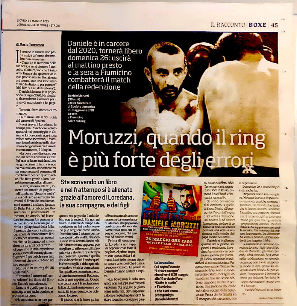 La boxe è stata la sua compagna di viaggio nell’ultimo anno e mezzo nel carcere di Spoleto. Arrestato il 3 luglio del 2020, ha scontato quattro anni di detenzione (estorsione è il reato per cui è stato condannato). Domenica 26 maggio, alle 9, è arrivato il fine pena. È uscito dall’Istituto penitenziale umbro per fare ritorno a casa. A Fiumicino. La sera stessa è salito sul ring contro il siciliano Ignazio Di Bella. Vittoria ai punti in sei riprese, dopo più di otto anni di assenza dal ring (non combatteva dal 30 aprile 2016).