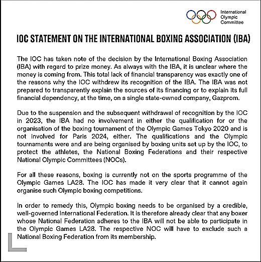 Per porre rimedio a questo, la boxe olimpica dovrà essere organizzata da una Federazione Internazionale credibile e ben governata. È quindi chiaro che qualsiasi pugile, la cui Federazione Nazionale aderisse all’IBA, non potrà partecipare ai Giochi Olimpici LA28. Il rispettivo Comitato Olimpico Nazionale dovrà escludere la Federazione Pugilistica Nazionale dai suoi tesserati.”