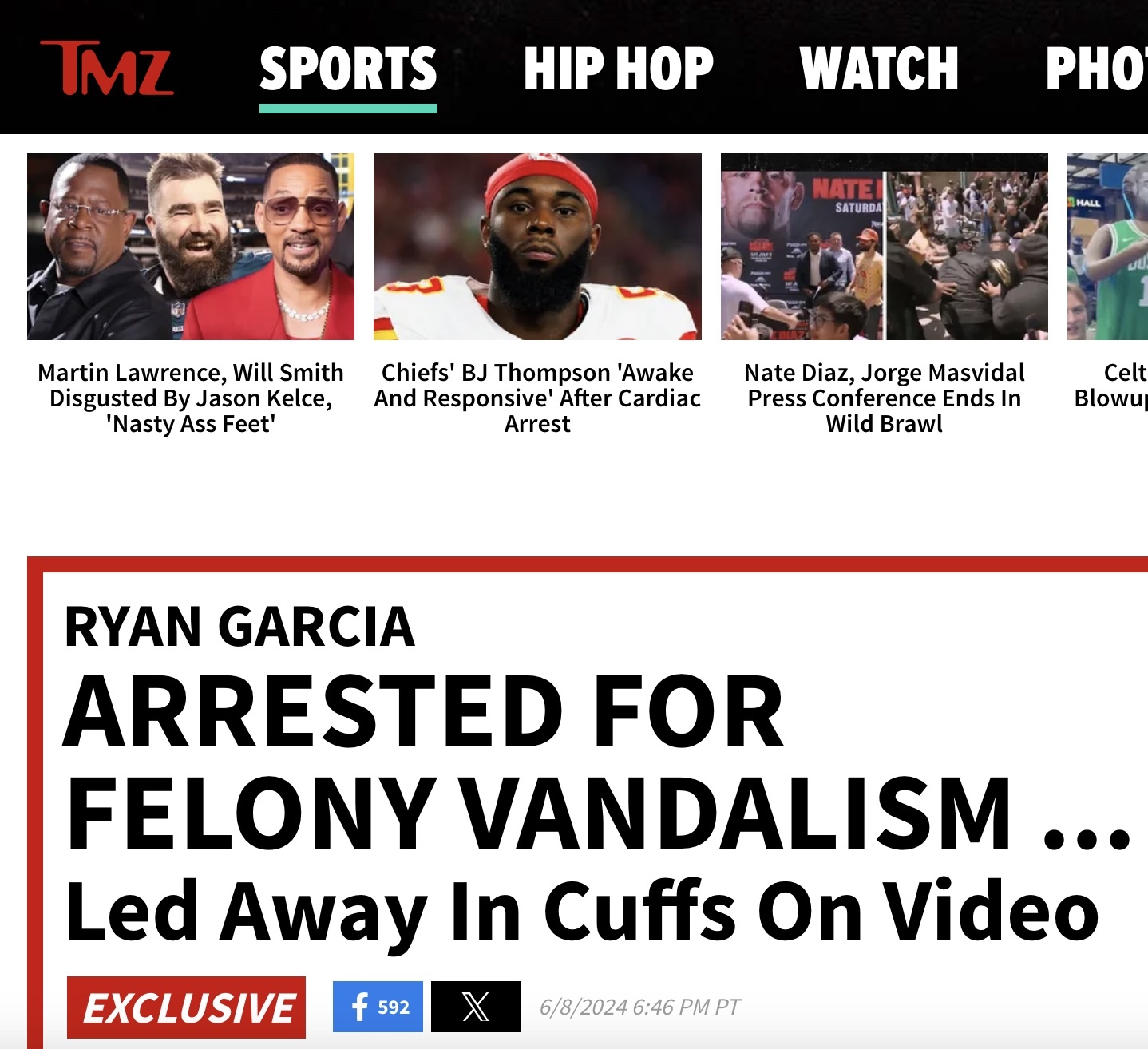 TMZ è riuscito anche ad avere un video e lo ha mostrato sul suo sito. Si vede Garcia (casco da sparring, torso nudo, pantaloni della tuta e scarpe da ginnastica) uscire ammanettato dalla porta dell’albergo, tenuto in custodia da due poliziotti.