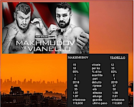 La mole del russo (19-1-0, 18 ko), quasi nove chili più pesante del romano, la sua maggiore esperienza, la potenza del pugno hanno convinto i bookmaker a indicarlo come favorito. Ma in un paio di giorni le quote sono leggermente cambiate a vantaggio del nostro pugile: Makhmudov è dato a 1,40; Vianello a 3,30.