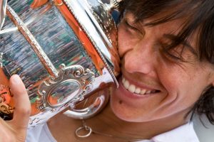 Ha appena vinto il Roland Garros. Si rotola sulla terra rossa del Centrale, la bacia, la mangia. Si rotola per sporcarsi il bianco del completino, per sentire sulla pelle la terra del campo. È una gestualità pagana che le permette di vivere questa avventura sino in fondo.
