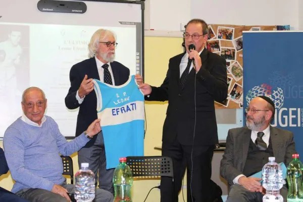 I tedeschi sapevano che Leone era un pugile (nella foto sopra, Romolo Efrati, la canottiera da combattimento della boxe Efrati mostrata dal giornalista Stefano Petrucci, Claudio De Camillis, il Rabbino Funaro) e a loro piaceva vederlo combattere. Così lo mettevano su un ring quasi ogni giorno contro uomini molto più pesanti di lui. La posta in palio era spaventosamente alta. Se vincevi, andavi avanti. Se perdevi, quasi sempre facevi una brutta fine.