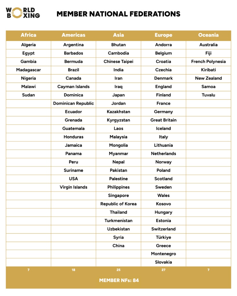 A febbraio del 2022 il CIO aveva stilato un programma iniziale per la prossima Olimpiade americana. E la boxe non c’era. Nel febbraio del 2025, aveva ufficializzato un riconoscimento provvisorio come Federazione Internazionale per la World Boxing, che adesso conta su 84 Federazioni Nazionali aderenti (vedi lo specchietto sotto). Oggi il CIO ha compiuto il penultimo passo verso il reintegro.