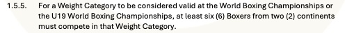 (nella World Boxing Cup non è valido il punto 1.5.5. del regolamento in vigore ai Mondiali, secondo il quale affinché una categoria di peso sia considerata valida, almeno sei (6) pugili provenienti da due (2) continenti devono competere in quella categoria di peso).