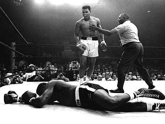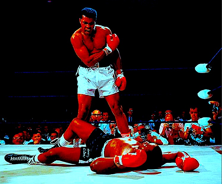 Al terzo destro scagliato da Ali, Liston stramazza al tappeto subito dopo avere abbozzato un jab sinistro. Un lampo e l’Orso è lì, disteso, quasi immobile. Il campione gli sta sopra e lo sfida urlandogli contro.