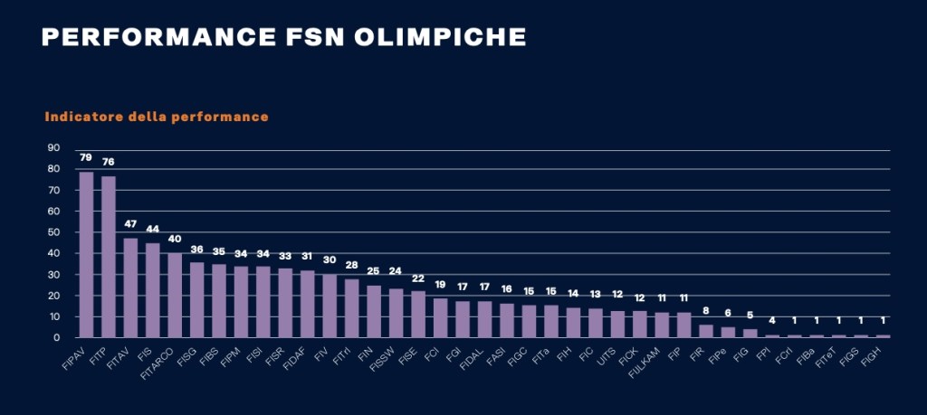 Sport e Salute nel rapporto pubblica anche una classifica di rendimento delle vare Federazioni Nazionali. Lo fa attraverso parametri che fanno riferimento ai risultati ottenuti alle Olimpiadi, ai Mondiali e agli Europei.